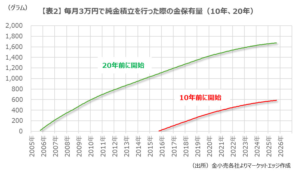 純金積立は日々の金の値動きに一喜一憂しない長期投資が基本になります。では、毎月3万円の純金積立を続けた場合、どの程度の量の金を保有できるのでしょうか。【表2】は、10年前(2015年10月)と20年前(2005年10月)からそれぞれ純金積立(毎月3万円)を開始した際の、現在までの金保有量の変化をグラフ化したものです。10年前から開始した場合だと2025年9月時点で約586.6グラム、20年前から開始した場合は約1,673.8グラムが購入されています。時間をかけて、特に金価格が安い局面でより多くの金を購入することで、着実に金の保有量が増えます。