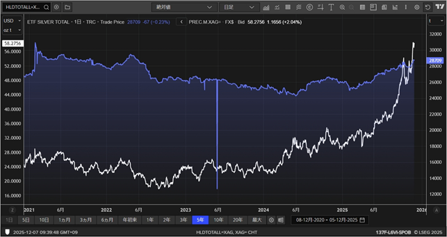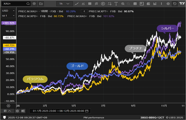 それから半年以上が過ぎた今シルバーはどうなったでしょうか。5月初旬32ドルであった価格は12月初旬59ドルまで上昇、歴史的高値の更新を続けています。シルバーの年初来騰落率はなんと101%となり、価格は年初の倍となりました。今年のすべての投資商品の中でもシルバーの100%超えの上昇率は圧倒的な1位です。ちなみに上位4位まで貴金属が独占となり、2位のプラチナは80%、3位4位はパラジウムとゴールドがほぼ同率の60%となっており、それに次ぐ5位はコーヒー豆の32%となり、大きく水をあけており、まさに2025年は貴金属の年であったと言えます。それが資金運用者の貴金属を持たざるリスクを顕在化し、さらに貴金属に投資資金が集まるという連鎖が起こっており、さらに貴金属の上昇を加速させるというマーケットになっているのです。