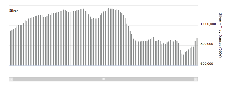 - 2シルバーETFへの投資の増加。世界のシルバーETFのおそらく80%以上がそのメタルをLoco Londonで保管しており、それに関しては手をつけることができない。ETFの残高は現在28,709トンあり、そのうち80%がLoco Londonで保存されているとするとその量は22,967トンとなる。