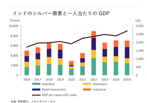 - 4インドでシルバー需要が盛り上がっており、今年2025年の年間輸入量は700トン辺りになる見込み。