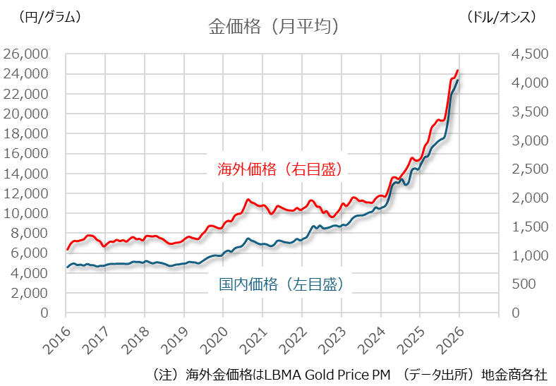 金投資家層の広がりも25年の大きな特徴です。22年以降は各国中央銀行が金準備の購入を強化していましたが、25年は機関投資家の金需要も主に金上場投資信託(ETF)経由で急増しました。「株式と債券」による伝統的ポートフォリオでは資産を防衛できない時代に突入したとの危機感から、大手金融機関からも「株式と債券と金」という新しいポートフォリオが提唱されました。そして、従来だと高値では買い控えや売却を行うことで金価格の高騰を鎮静化する役割を果たしていた個人投資家も、過去最高値の金を買い続けました。