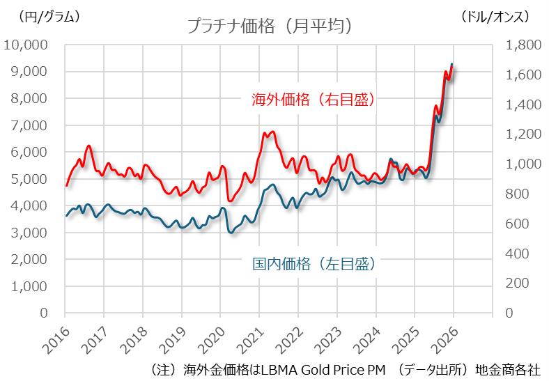 プラチナに関しては、トランプ米政権の関税策の不透明感が中心テーマとなりました。銀や銅などでも同様の動きがみられましたが、サプライチェーンの混乱を警戒して、米国に大量のプラチナ地金が持ち込まれました。その影響でロンドンなど米国以外の地域で在庫にタイト感が強まり、リースレートの上昇と連動して、年末に向けて底固い展開が続きました。