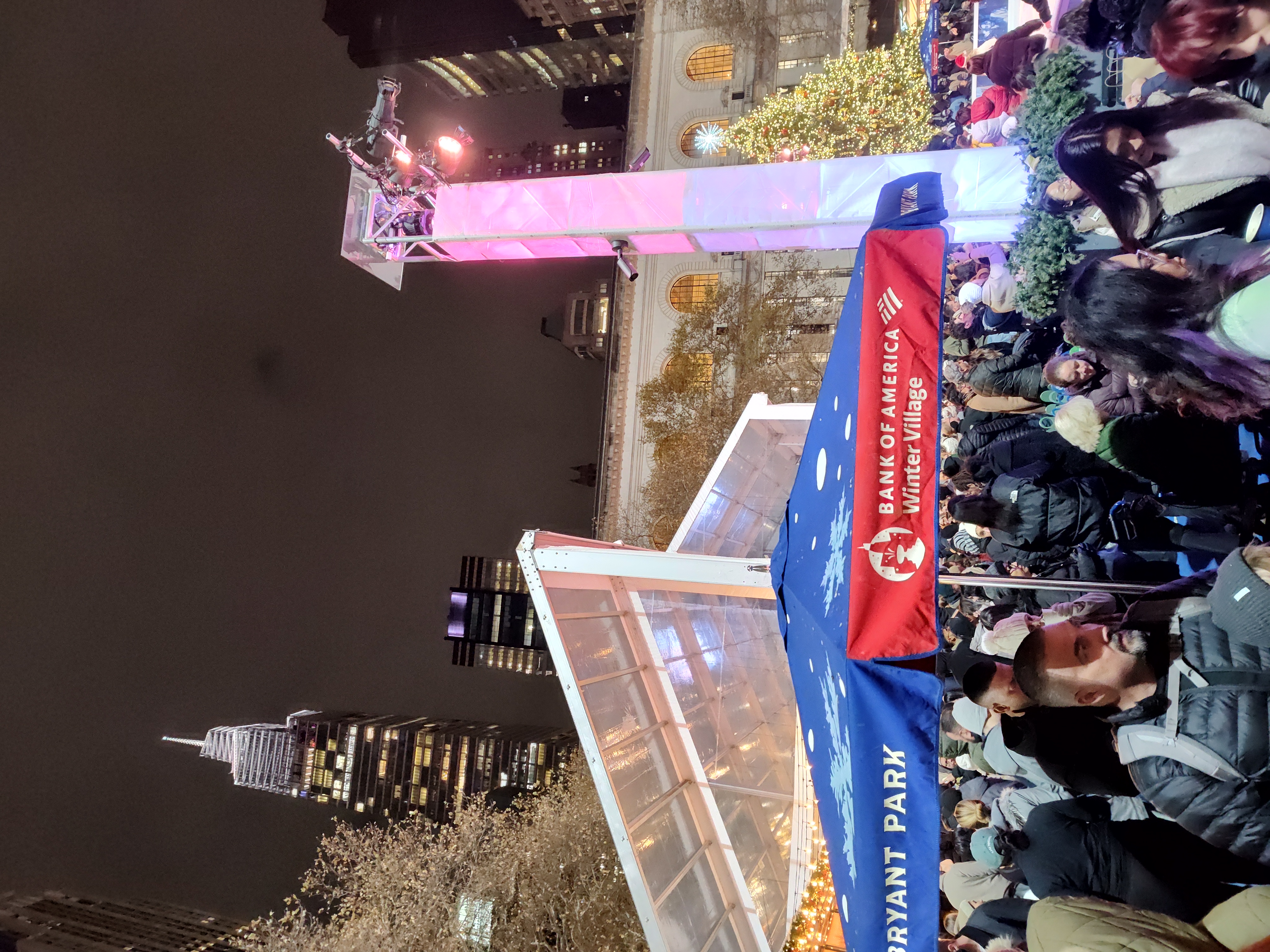 次は、6アベニューと42丁目の角にあるブライアントパークで冬の間開催される、ウィンター・ビレッジです。ここは中央にアイススケートリンクが設置され、その周りには様々なお店が並んでいます。当初は開催期間も短く、お店もクリスマスショッピングの時期だけだったのですが、近年は期間も延長、飲食店を中心に3月1日まで開かれています。アイススケートを楽しむ人はもちろんですが、その周りの屋外テーブルでは、氷点下の気温の中でも人々がスケートを見ながら食事を楽しんでいます。ニューヨーカーはホントに元気ですね。