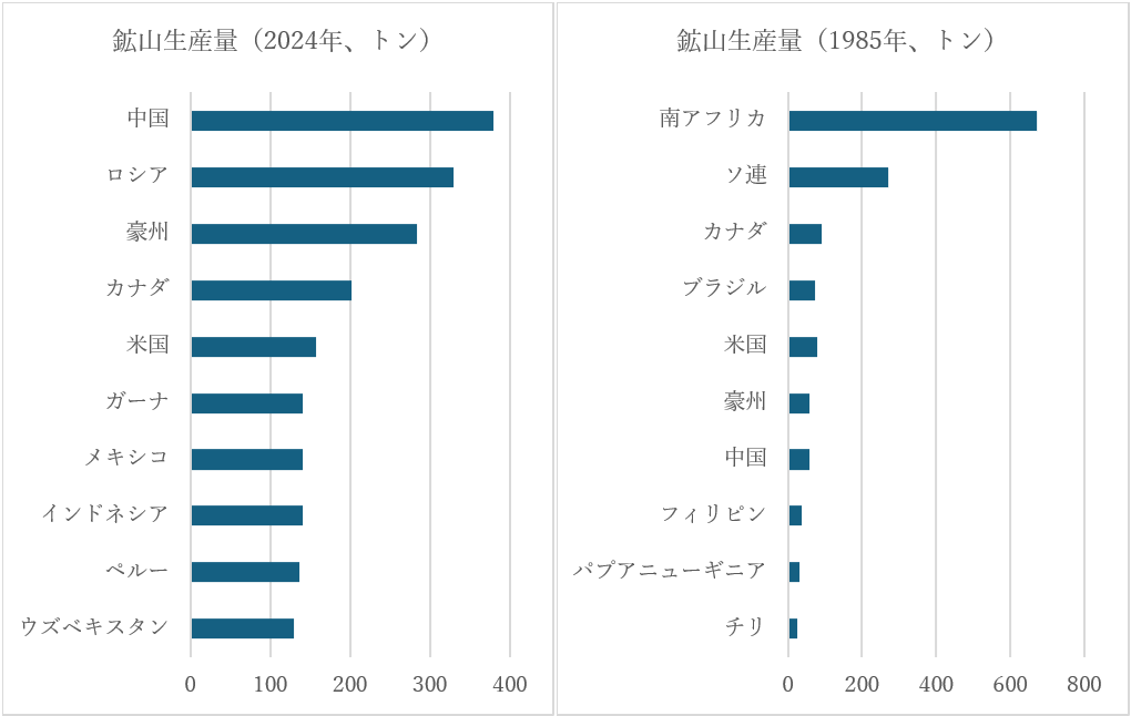 金の産出国や需要国は時代とともに変化しています。現在と1980年代を比較して、どのような変化が金市場で起きたのかを考えてみましょう。金市場を通して国の盛衰が見えてきます。1月21日のコラムで小菅さんが「産金国ランキングのトップ5」を取り上げていらっしゃいました。それを10位まで棒グラフにして並べたのが下の左グラフになります。右のグラフは南アフリカ共和国がダントツの1位だった1985年の順位です。24年はワールド・ゴールド・カウンシル(WGC)の集計で、85年は「Goldのすべて’93」(紀伊國屋書店)に掲載されていたGFMS社(当時)のデータを使いました。