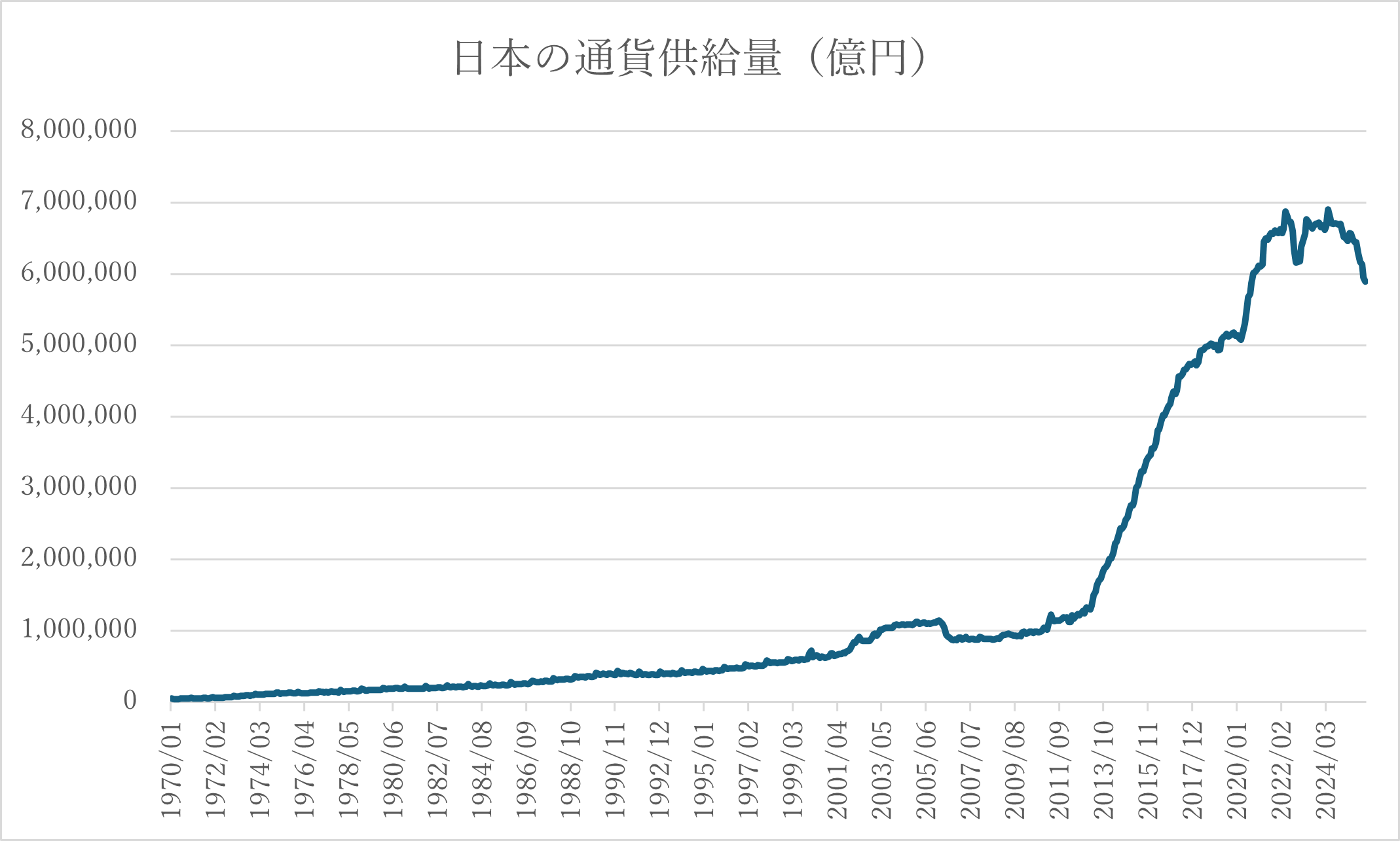 下にあるグラフ(上)は米国の通貨供給量(マネタリーベース)を示しています。リーマン・ショック(2008年)や新型コロナウィルス禍(20年)といった危機への対策でお金の量が飛躍的に増えたことが分かります。厄介なのは、一度増やしてしまったお金はなかなか減らせないことです。結果としてお金の量は1960年の100倍以上の規模に膨れ上がってしまったのです。日本も同じです。お金の量は「黒田バズーカ」(異次元の量的・質的金融緩和)を放った黒田東彦日銀総裁時代に急増(グラフ下)。一時は600兆円を上回り、1970年の150倍近くまで膨張しました。